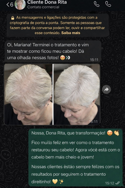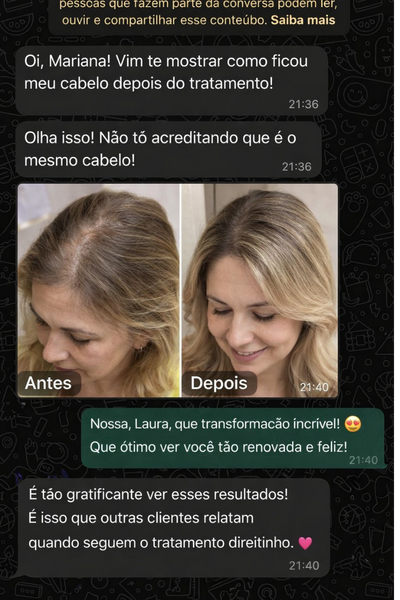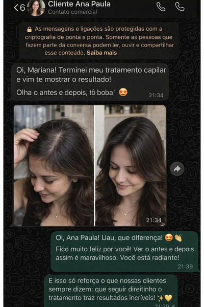 Sua queda capilar começa a diminuir perceptivelmente. Os fios ganham mais resistência e você já sente o cabelo menos quebradiço no dia a dia. O couro cabeludo fica mais equilibrado e hidratado, criando o ambiente ideal para novos fios nascerem.
